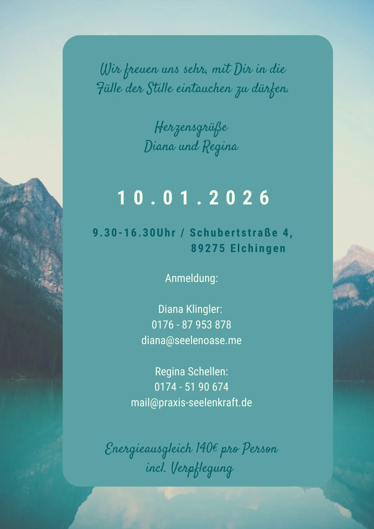 Die genauen Termine bekommst Du auf https://map.innerwise.com/listing/regina-schellen/ oder auf Anfrage.